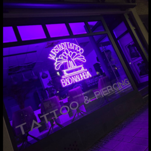 Wir wollten etwas, das cool aussieht und gleichzeitig professionell wirkt – Neonsfeer hat beides geliefert. Das “Kurstadttattoo Bad Nauheim” Schild ist ein echter Blickfang. Gerade bei Nacht hebt es sich super von der Straße ab. Viele Kunden machen direkt Fotos vor dem Fenster. Top Qualität und super verarbeitet!