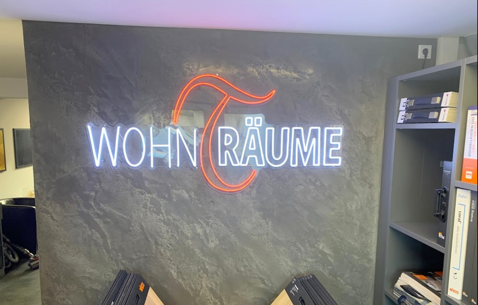 Unser Wohnstudio wirkt mit dem Neonschild von Neonsfeer viel einladender. “WohnTräume” leuchtet klar, modern und zieht sofort Blicke auf sich